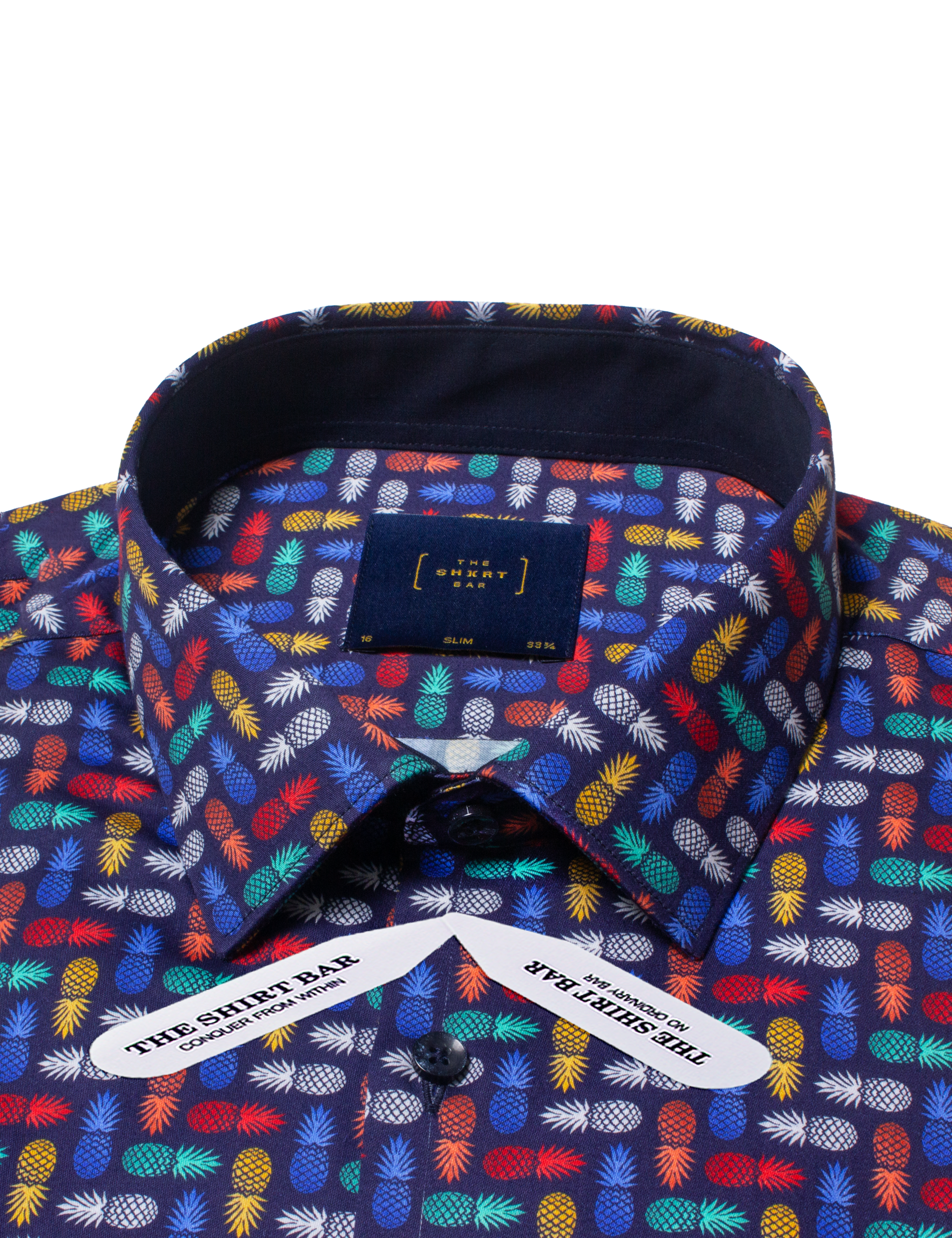 NAVY BLUE WITH MULTI-COLOUR PINEAPPLE PRINT SILKY FINISH SLIM FIT SHIRT